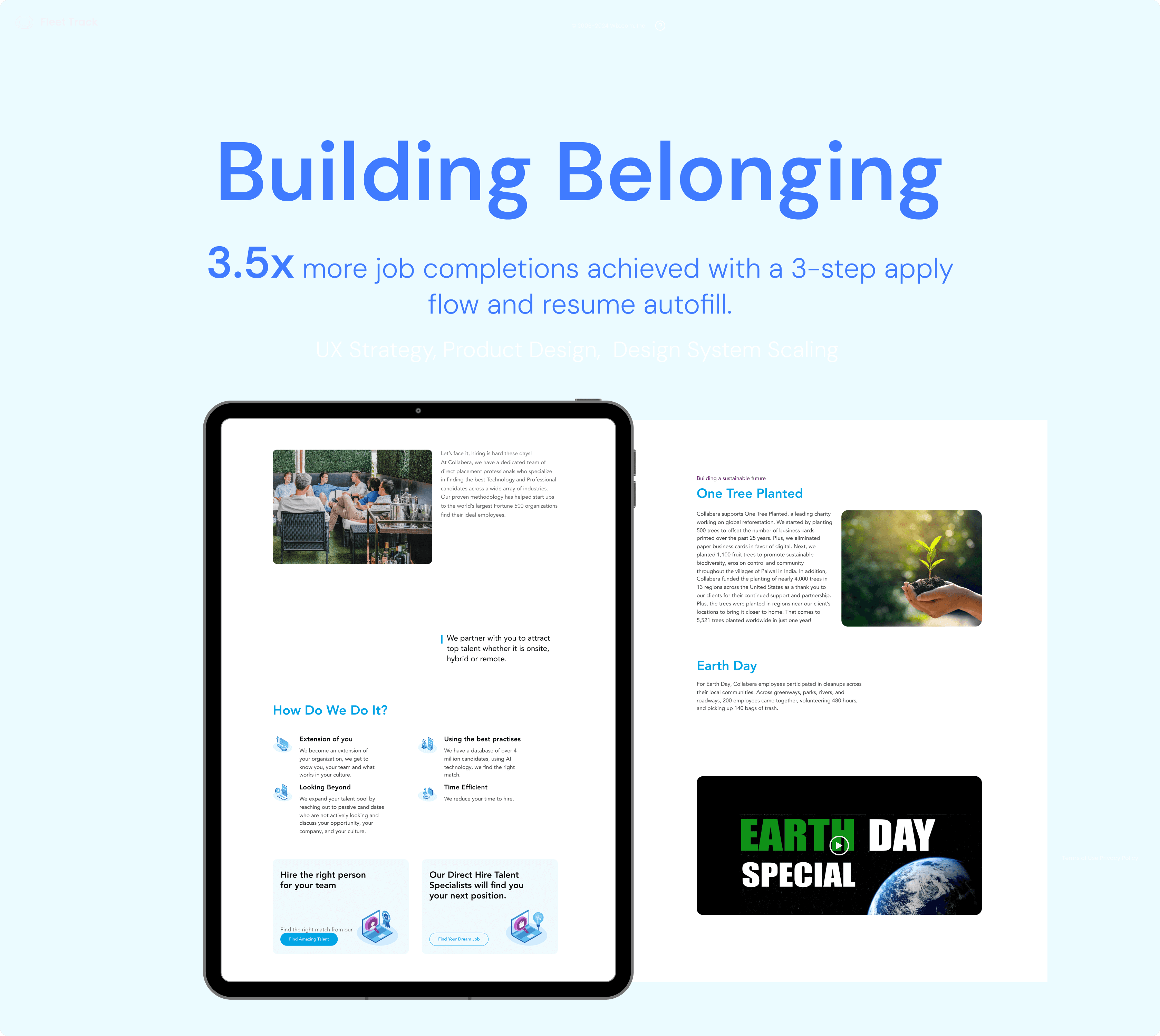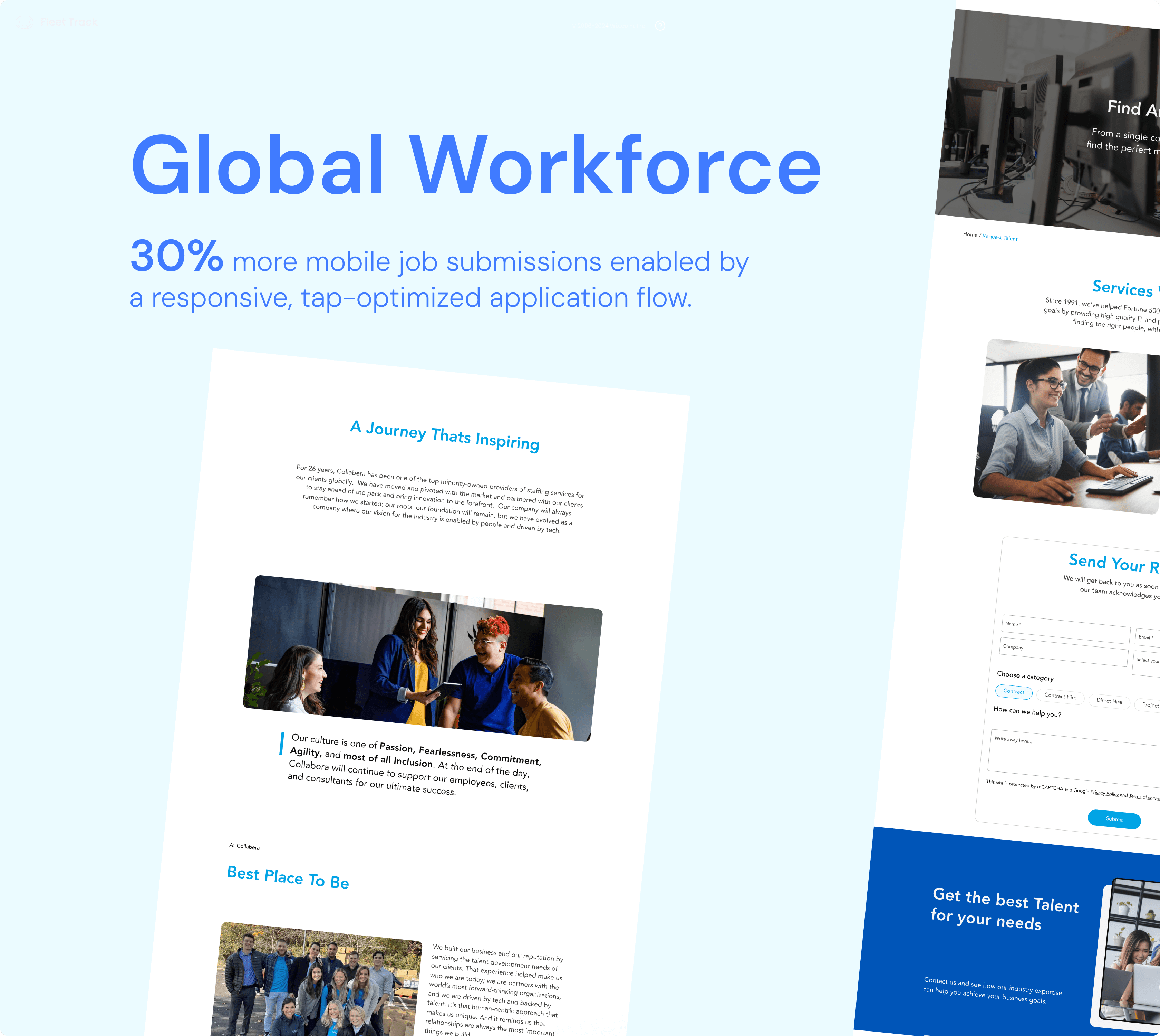 Collabera’s digital presence for potential hires and clients was fragmented, uninspiring, and generic. Their existing recruitment website lacked a strong value proposition for tech talent, and didn’t reflect their global scale, inclusive culture, or tech-forward identity.